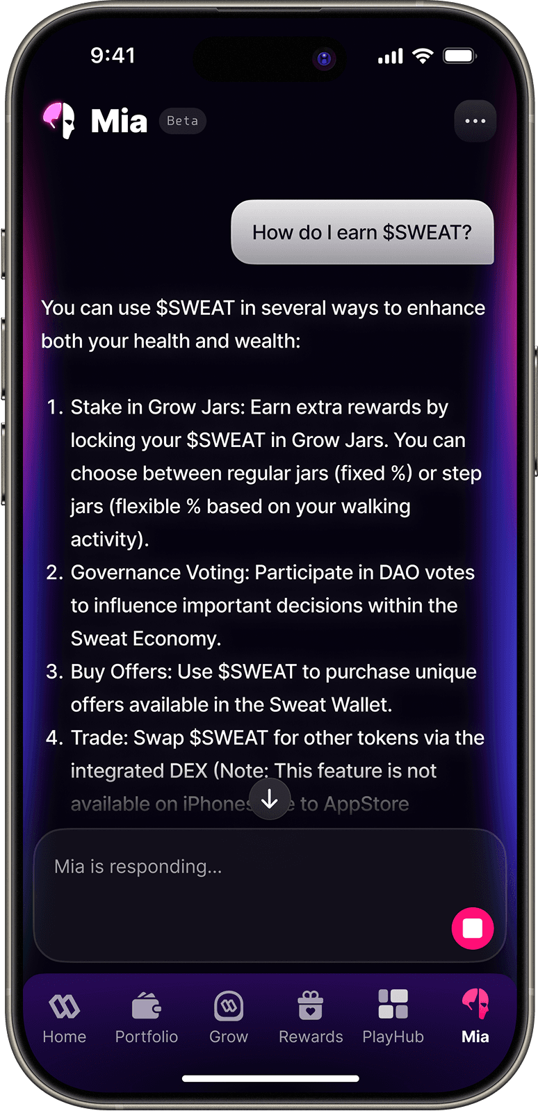 Meet Mia, your AI-powered guide. Maximize your $SWEAT earnings with personalized strategies.